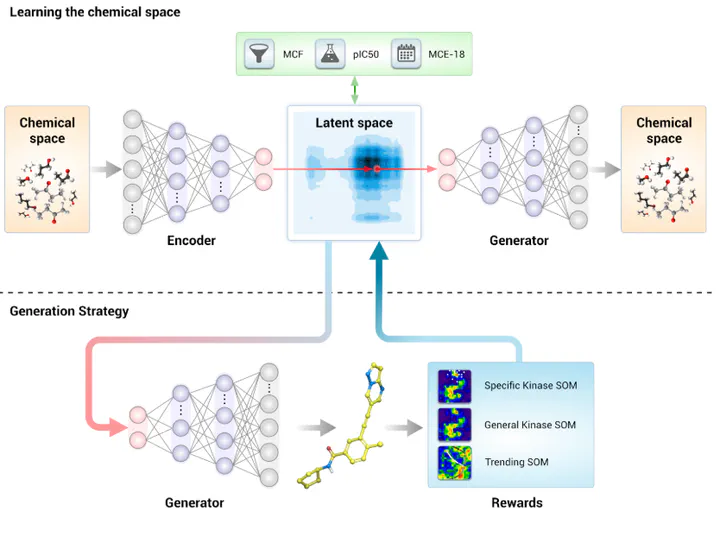 During training, Insilico Medicine used a prepared dataset and trained the AAE model to output the same SMILES molecule back. To optimize the model, three rewards functions were calculated: the trending SOM, General Kinases SOM, and the Specific Kinase SOM. Using principles of backpropagation and the Adam optimizer, the model was trained with a learning rate of 0.0001 and optimized for 300K updates.